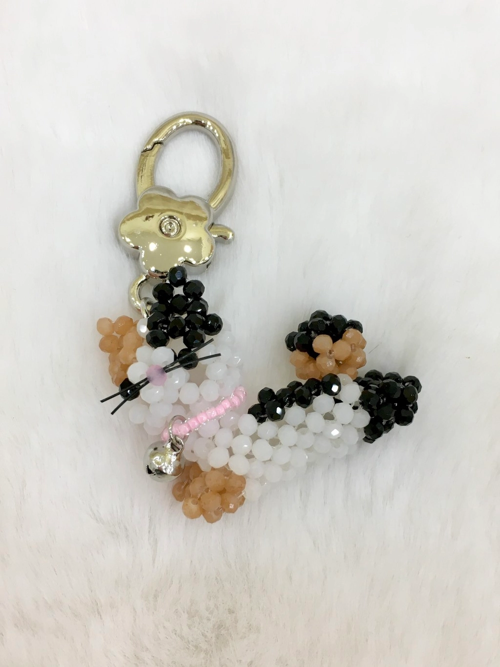 흰색과 검정색, 카라멜색이 어우러진 삼색냥이 키링입니다.