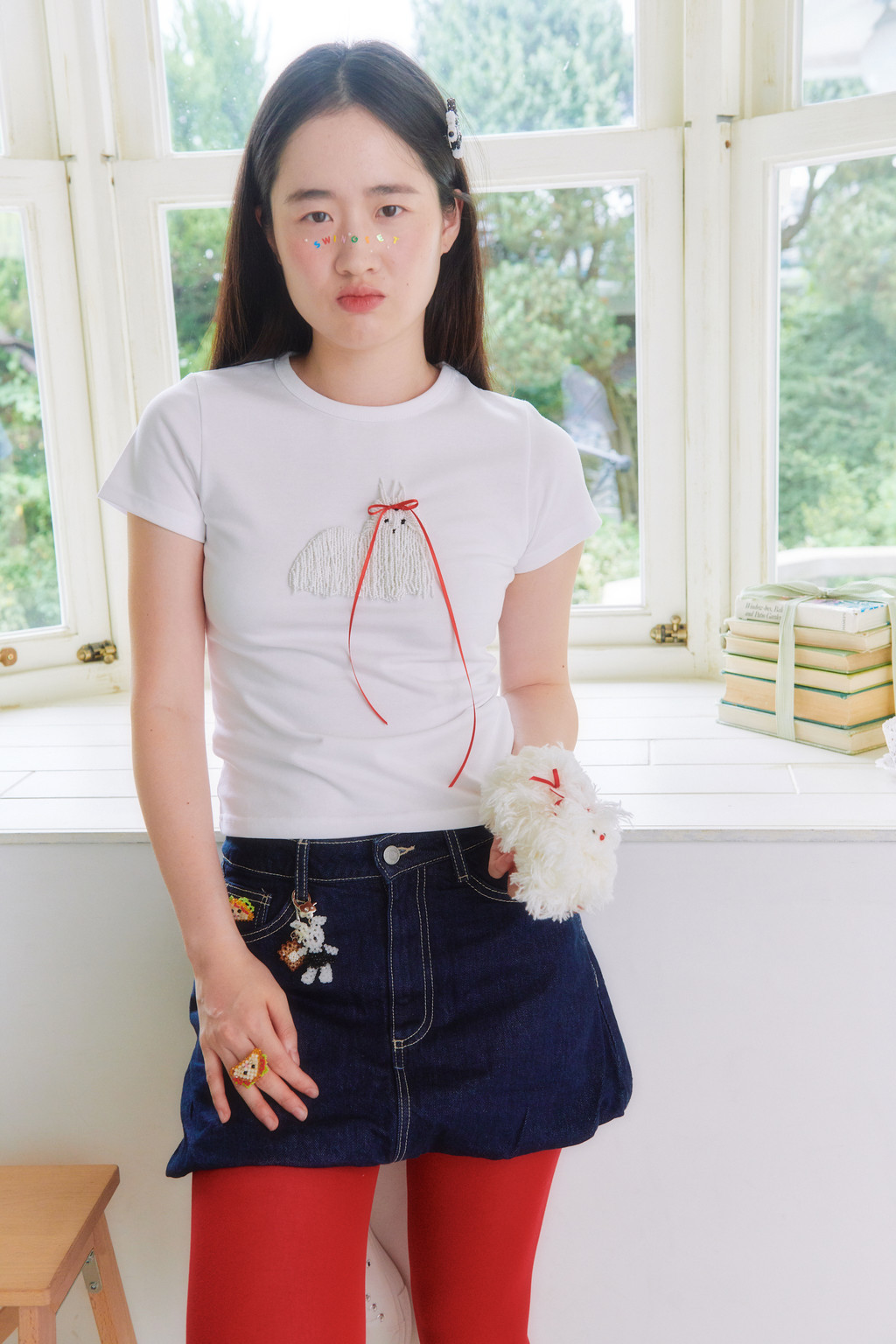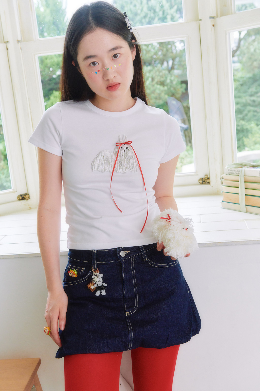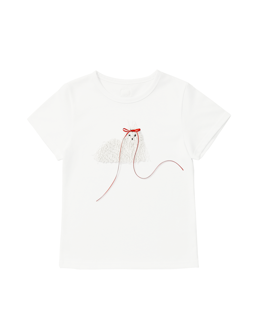 입체적인 비즈 작업으로 정교하게 표현한 말티즈가 돋보이는 유니크한 디자인의 티셔츠입니다.