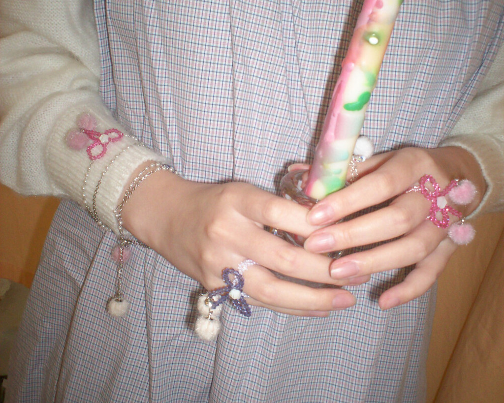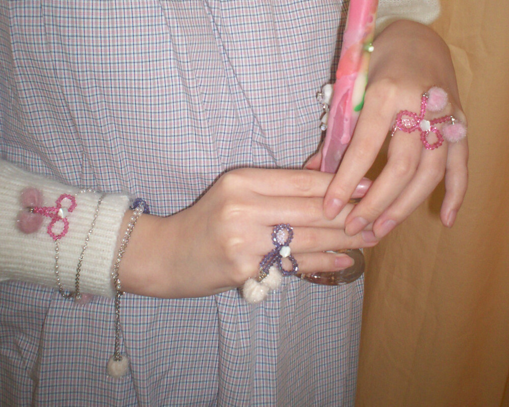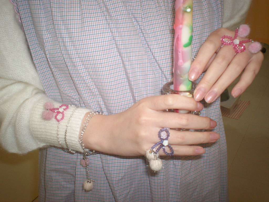핸드메이드로 정성스럽게 제작된 리본 모양의 비즈 팔찌입니다.