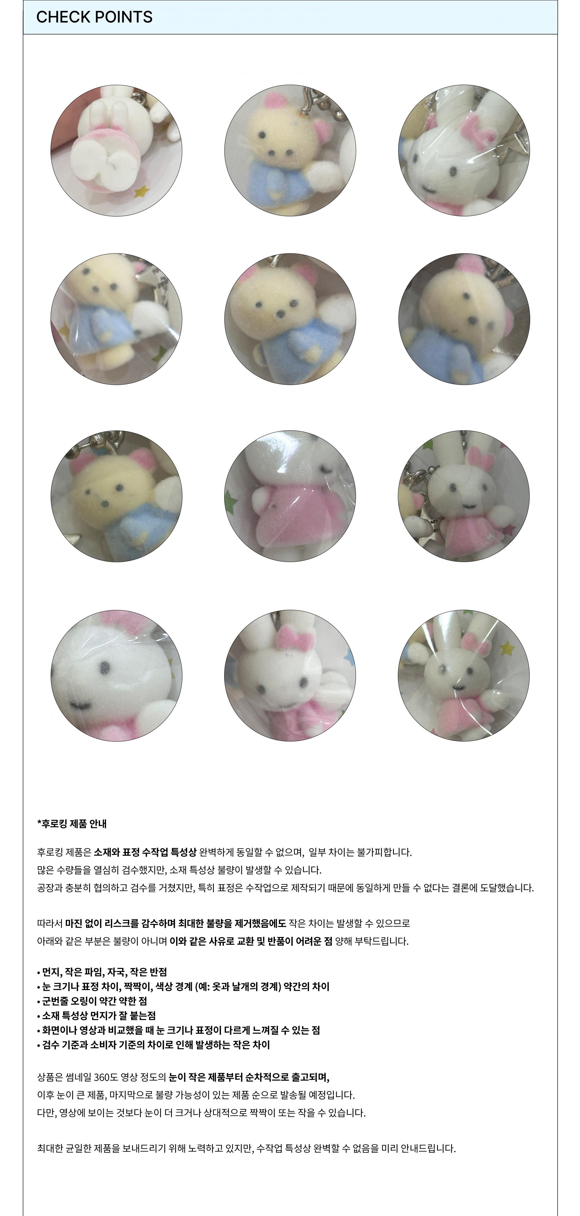 * 플로킹(Flocking)이라는 특수한 소재 및 공정 특성상, 제작 과정에서 아래와 같은 현상이 발생할 수 있습니다. 이는 자연스러운 부분으로 제품의 기능에는 영향을 주지 않습니다.