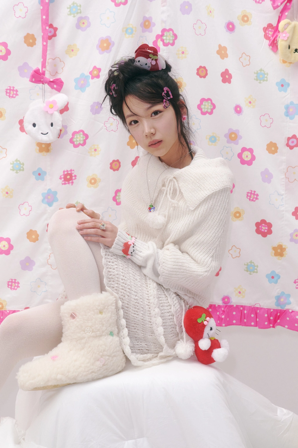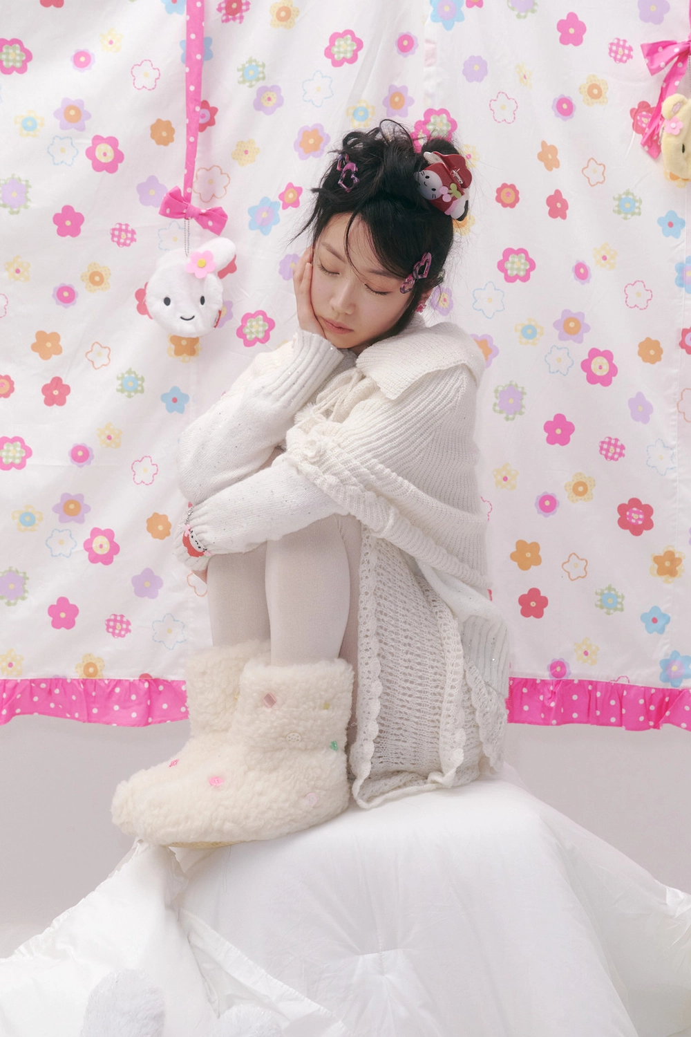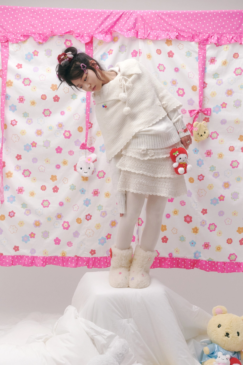 * 폼폼 장식이 달린 제품은 공정상 폼폼의 형태가 일정하지 않거나 연결된 리본끈이 반듯하지 않을 수 있습니다.