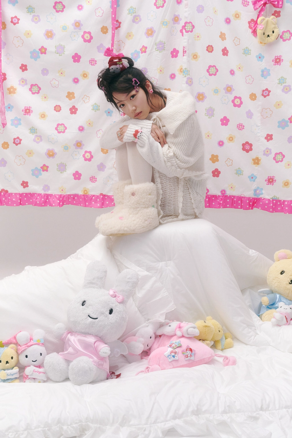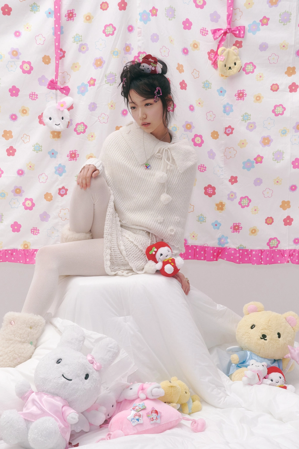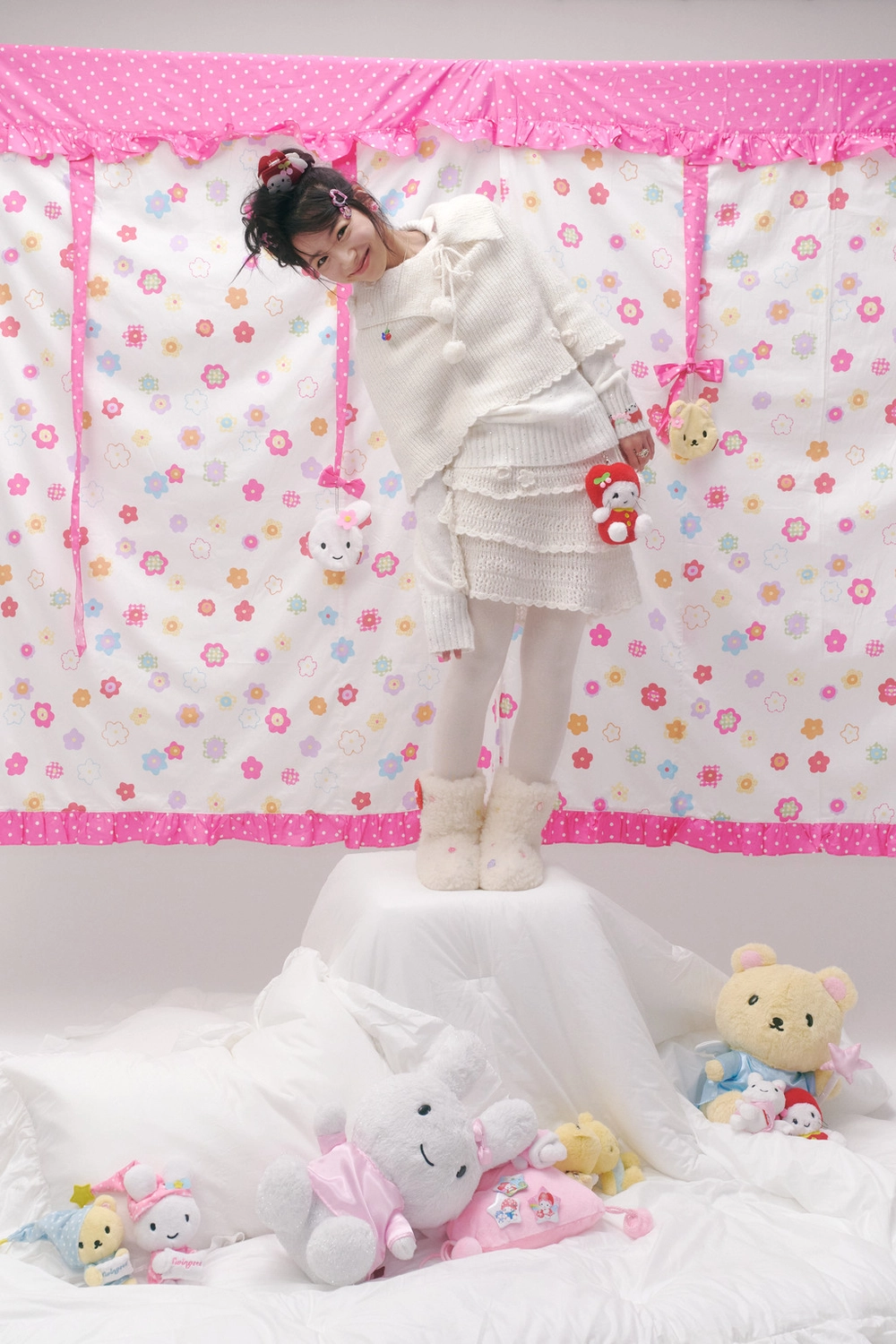 * 폼폼 장식이 달린 제품은 공정상 폼폼의 형태가 일정하지 않거나 연결된 리본끈이 반듯하지 않을 수 있습니다.