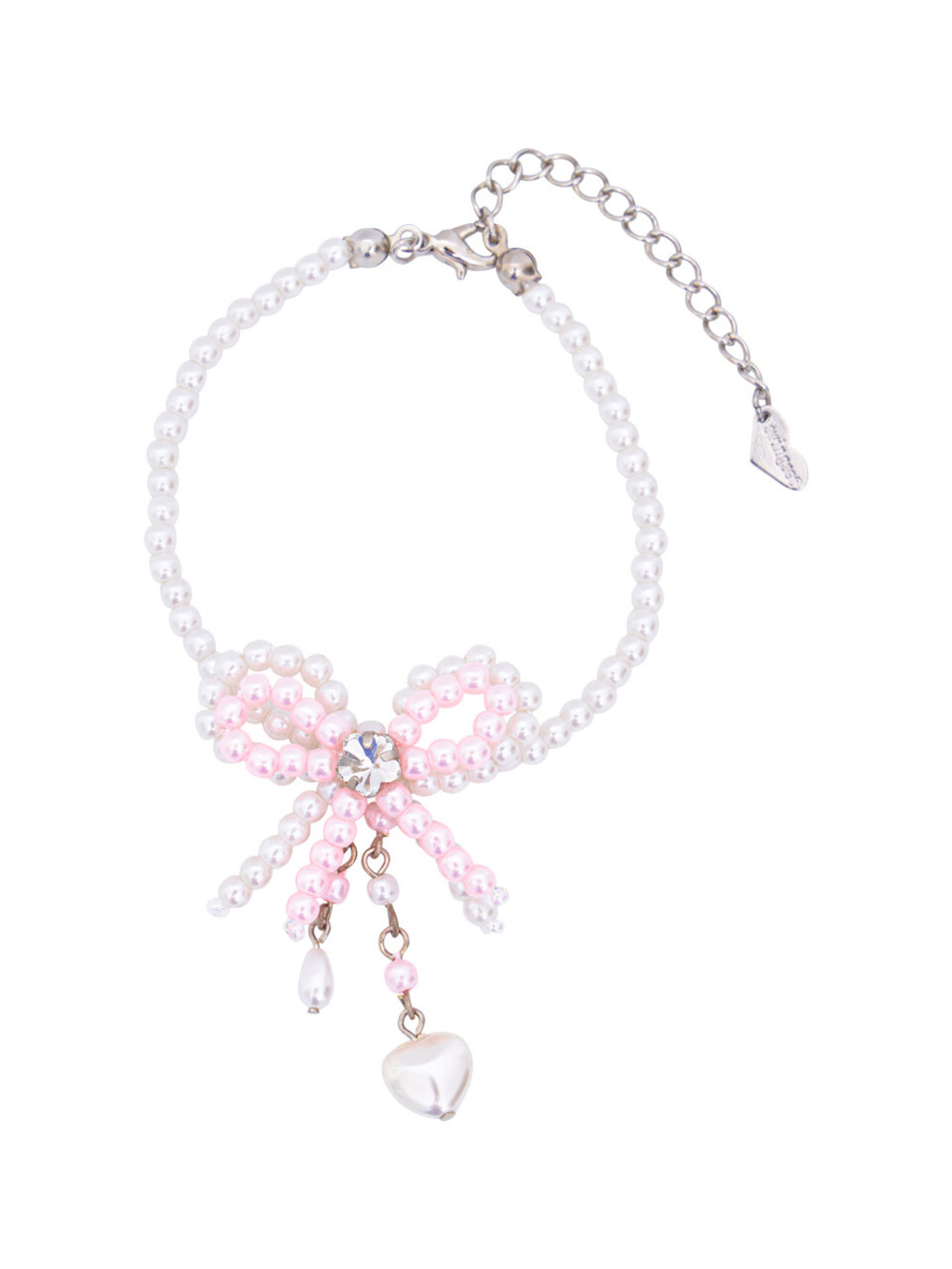 리본 밑으로 ♡ 모양과 드롭 모양의 핵진주 소재 꼬리를 달아 움직임에 따라 춤을 추듯 흩날립니다.
