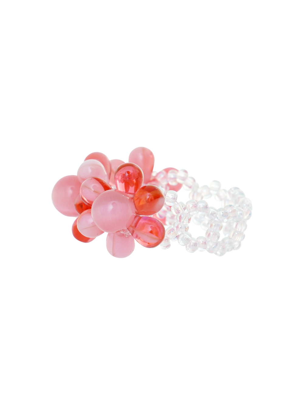 동글동글한 체코 드롭 글라스로 꽃잎을 표현한 후 캐츠 아이로 마무리한 꽃반지입니다.