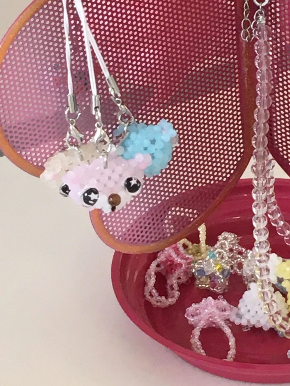 · 수작업 공정 특성상 매듭 처리, 리본 부착 부위의 본드 자국, 비즈 표면의 미세한 스크래치나 반점이 발생할 수 있습니다. 이는 대량 생산 제품과 달리 손으로 완성되는 제작 방식에서 비롯된 자연스러운 특징입니다.