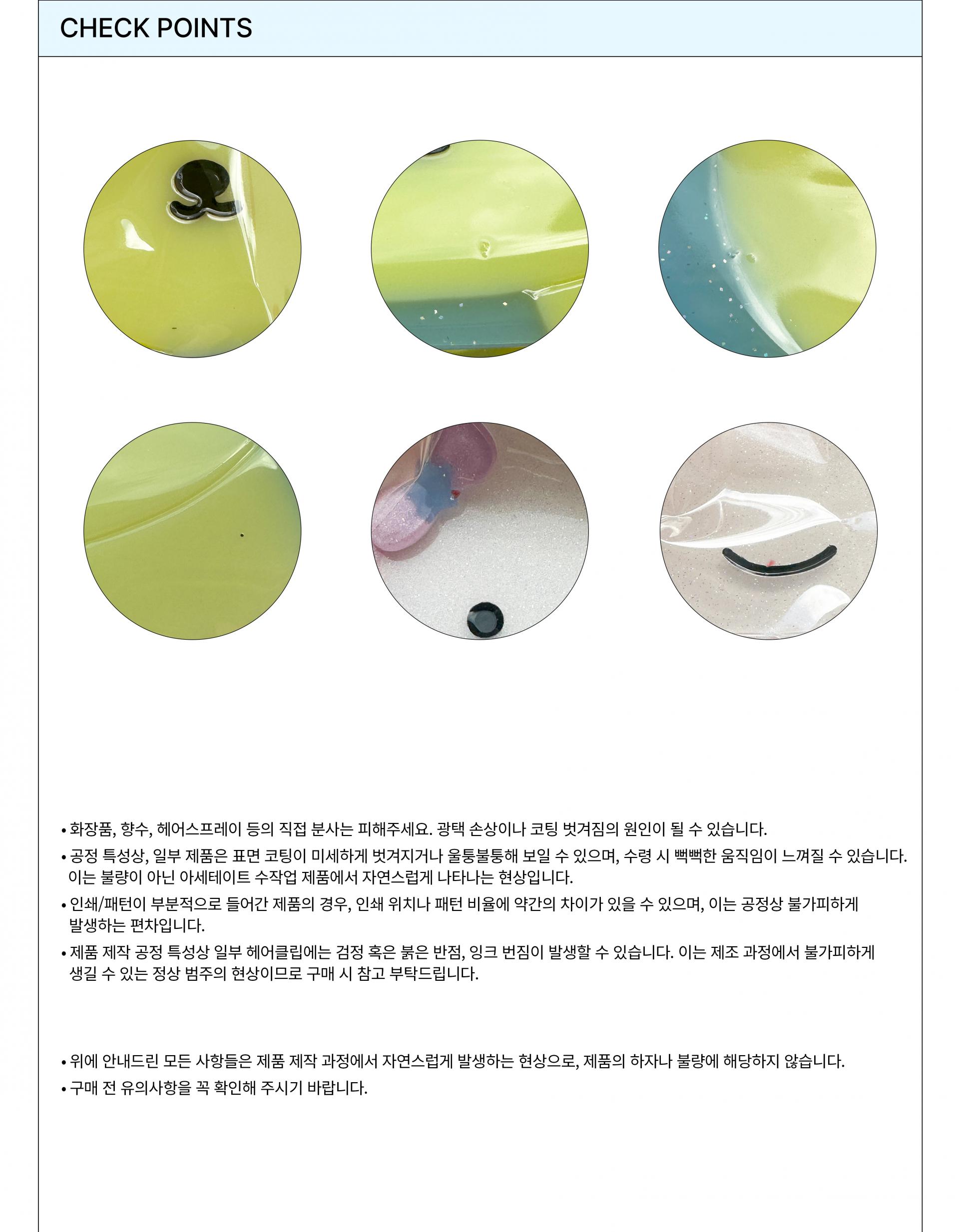 * 공정 특성상, 일부 제품은 표면 코팅이 미세하게 벗겨지거나 울퉁불퉁해 보일 수 있으며, 수령 시 뻑뻑한 움직임이 느껴질 수 있습니다. 이는 불량이 아닌 아세테이트 수작업 제품에서 자연스럽게 나타나는 현상입니다.